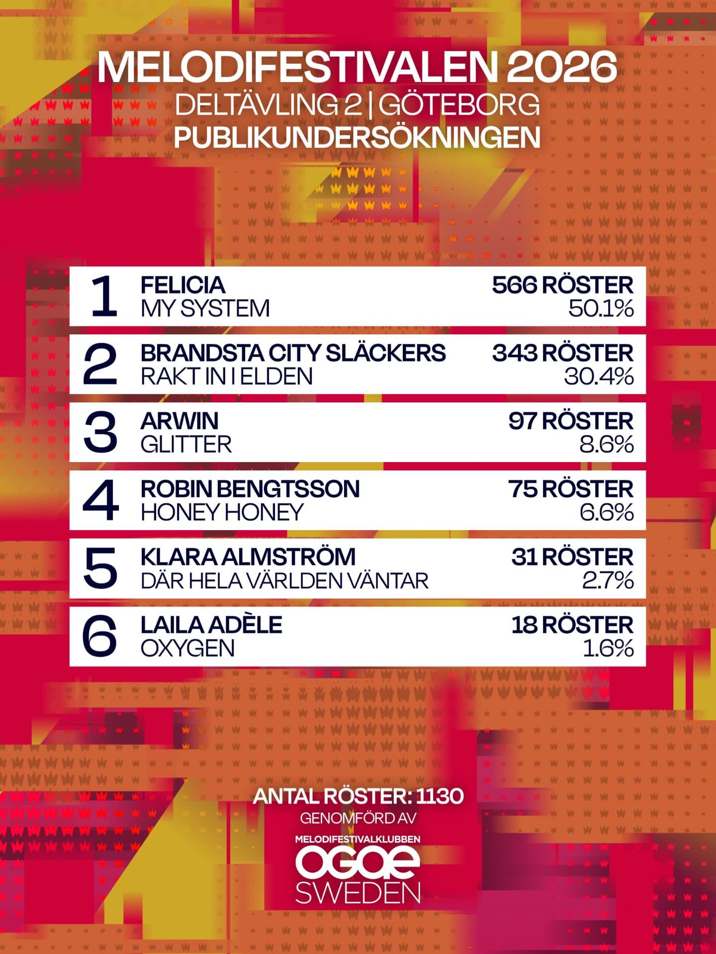Som altid laver den svenske Grand Prix-fanklub Melodifestivalenklubben en publikumsundersøgelse efter fredagens generalprøve, og aftenens resultat ser sådan ud: