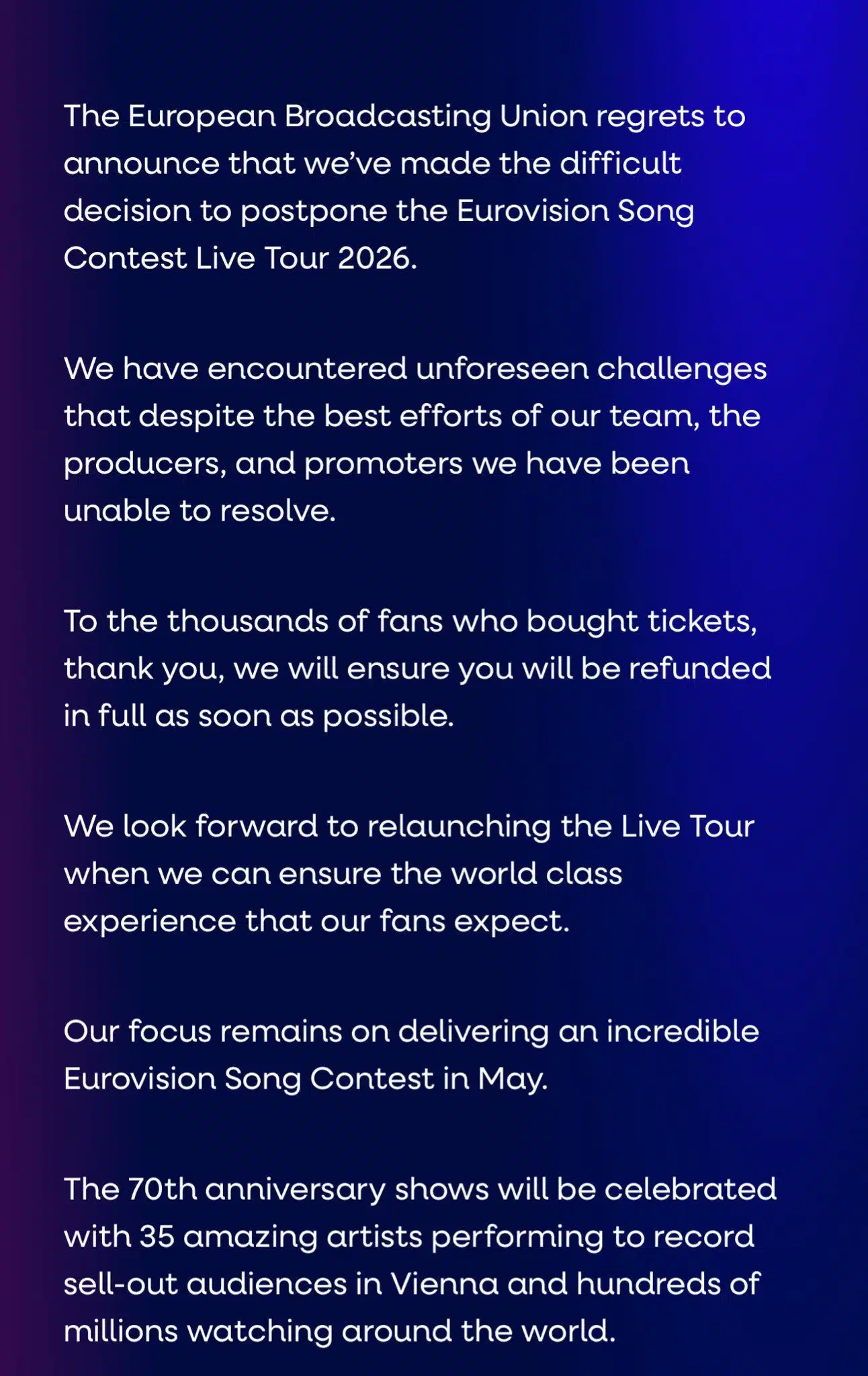 EBU offentliggjorde i slutningen af 2025, at man agtede at fejre konkurrencens 70-års fødselsdag med et brag af en fest. En stor turné med en række legender, som skulle ud i ti forskellige europæiske storbyer, herunder bl.a. København.