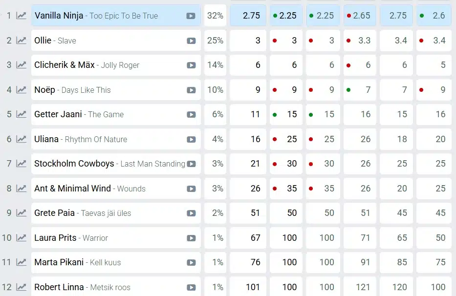 Hvis du er kommet for at se en gyser, så er Eesti Laul 2026 formentlig et ret godt bud. Favoritværdigheden er nemlig skiftet en del, men nu, lige op til showet, tror bookmakerne at det bliver til et Eurovision-comeback til Vanilla Ninja. Det er dog ikke mere end et par dage siden, at Ollie førte an hos bookmakerne, så intet er overhovedet afgjort. Samtidig er det værd at bemærke, at Clicherik & Mäx nærmer sig de to top-kandidater.