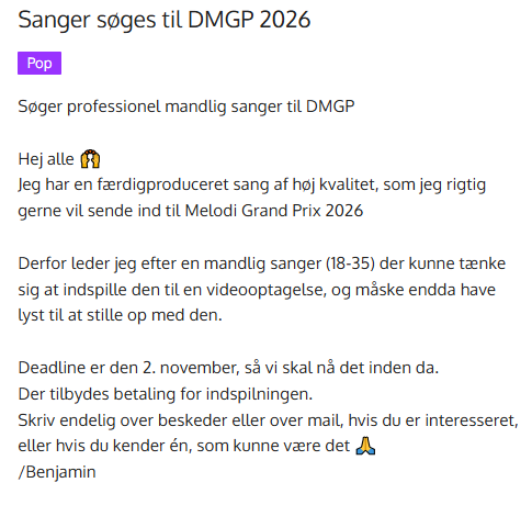 I starten af september søgte Benjamin (Udfra mail adressen gætter vi på, at han hedder Benjamin Vammen) efter en sanger til DMGP 2026. Vi har dog ikke kunnet finde flere informationer om denne person.