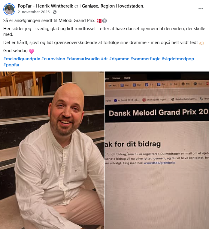 Popfar, Henrik Winthereik, uddannet sanger fra Det Jyske Musikkonservatorium i Aalborg og Reumert-vinder med “Sommer i Tyrol” på Nørrebros Teater, afslørede i november, at han har indsendt et bidrag – og danset sig igennem den video, der skulle sendes med – til DR. Vi ved ikke, om ansøgningen har båret frugt.