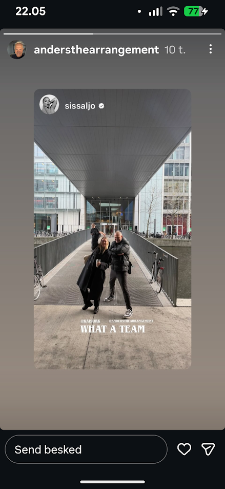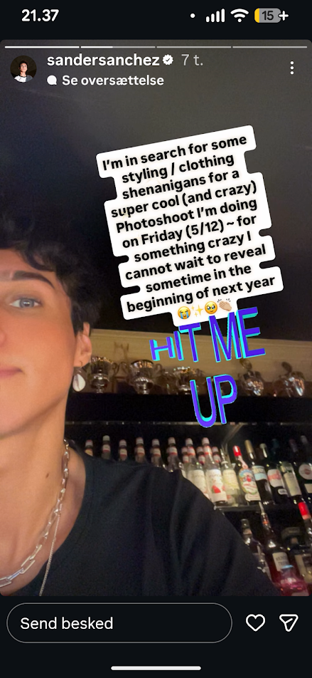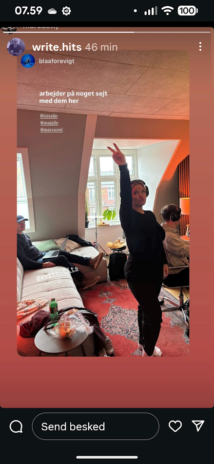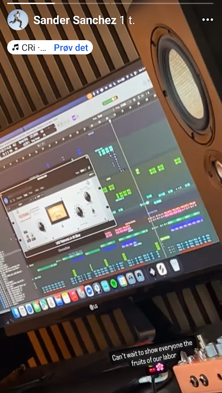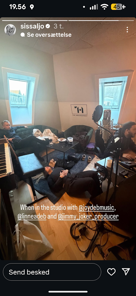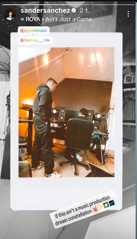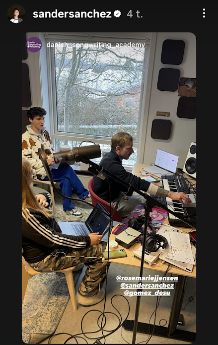 Sander har i den seneste tid delt flere stories fra studiet, blandt andet ledsaget af teksten “Can’t wait to show everyone the fruits of our labor”. På billedet ses han i det, der umiskendeligt ligner The Arrangements studie, i selskab med Melodifestivalen- og Eurovision-legenden Joy Deb samt Rasmus Rex – tidligere elev på Danish Songwriting Academy og i dag producer hos netop The Arrangement.