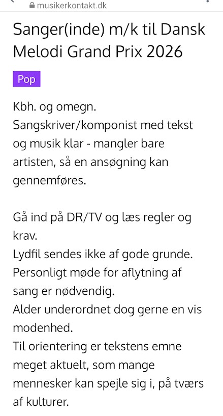 På samme medie, musikerkontakt.dk, blev der desuden søgt efter en sanger eller sangerinde til Dansk Melodi Grand Prix 2026. Afsender er Anders Klit, som har spillet i forskellige partybands. Vi er dog ikke kommet længere med dette hint.