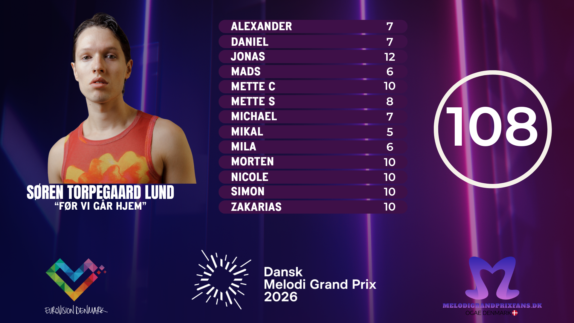 I en række artikler og reaktionsvideoer tæller vi ned til Dansk Melodi Grand Prix 2026, som afholdes 14. februar 2026 i Arena Nord i Frederikshavn. Her gennemgår vi årets sange med anmeldelser, point og (k)ærlige vurderinger – både på skrift og på video.