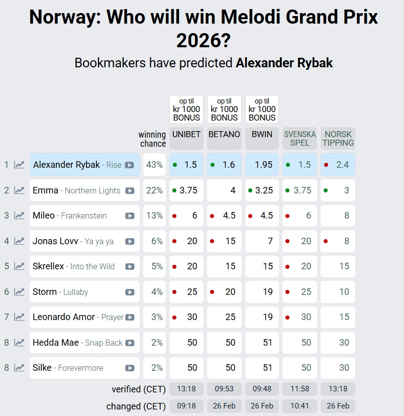Favoritværdigheden har, siden sangene udkom, svinget meget mellem to af sangene, men de seneste dage har Alexander Rybak taget føringen over Emma, og står derfor, ifølge bookmakerne, til at vinde billetten til Eurovision for tredje gang.