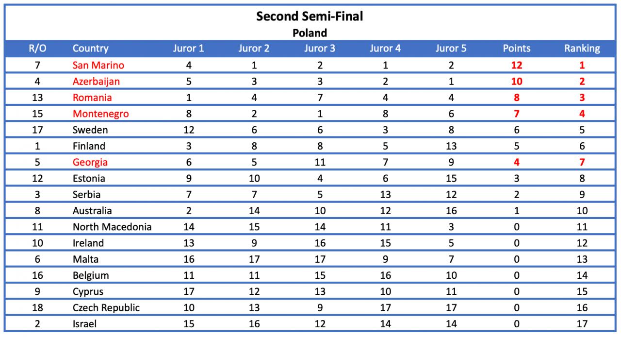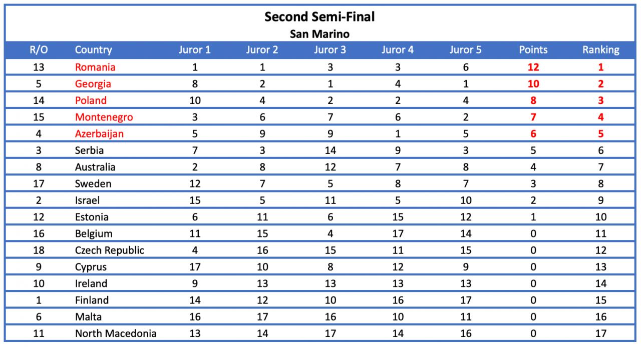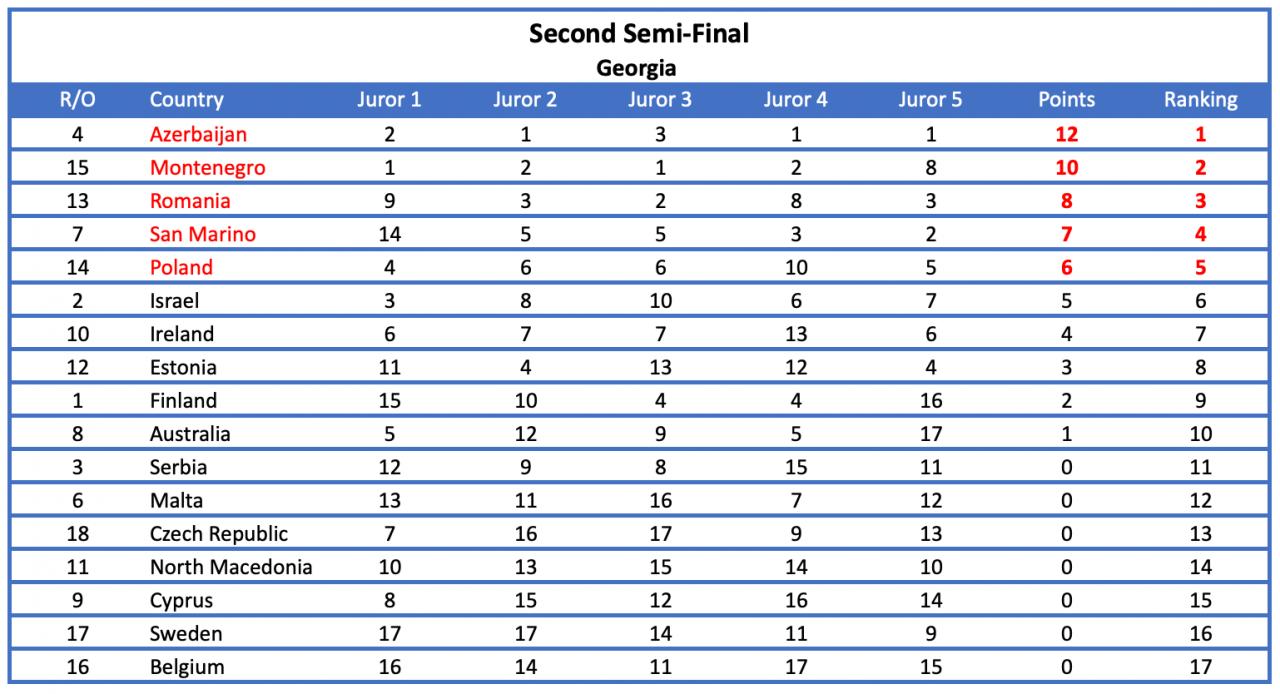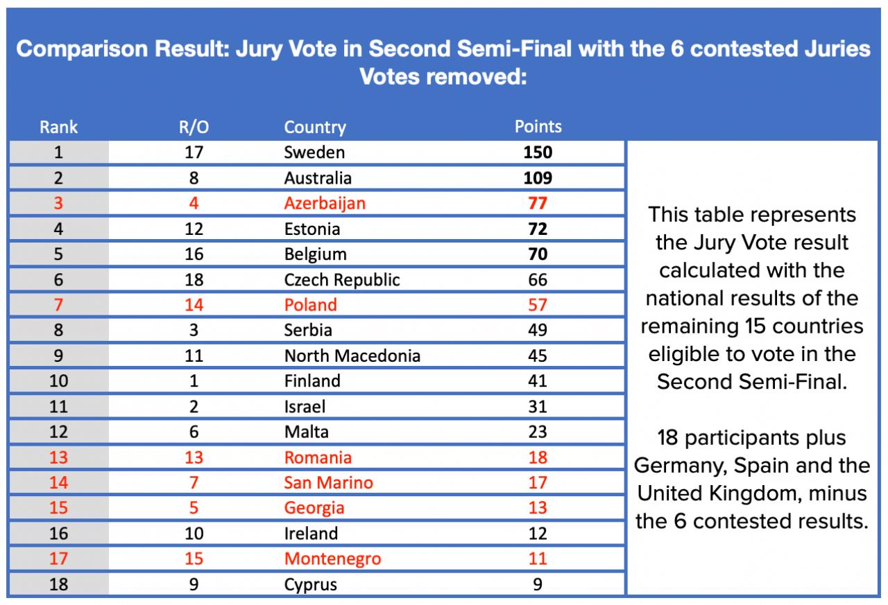 De uregelmæssige jurystemmer blev fjernet og i stedet blev disse erstatningspointfordelinger indsat.